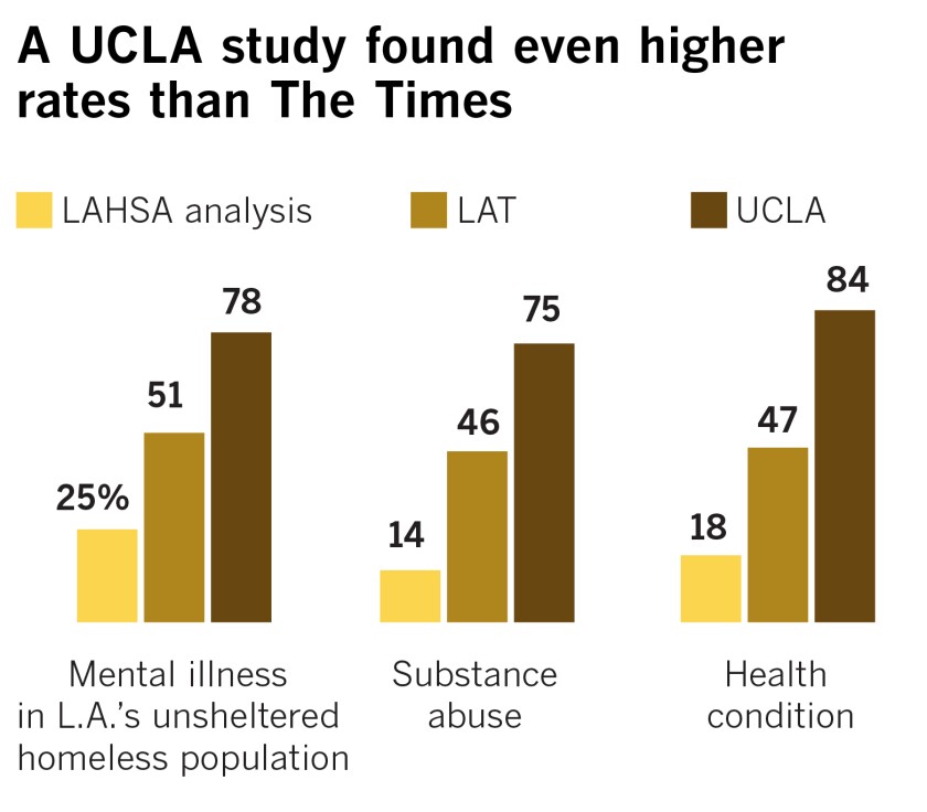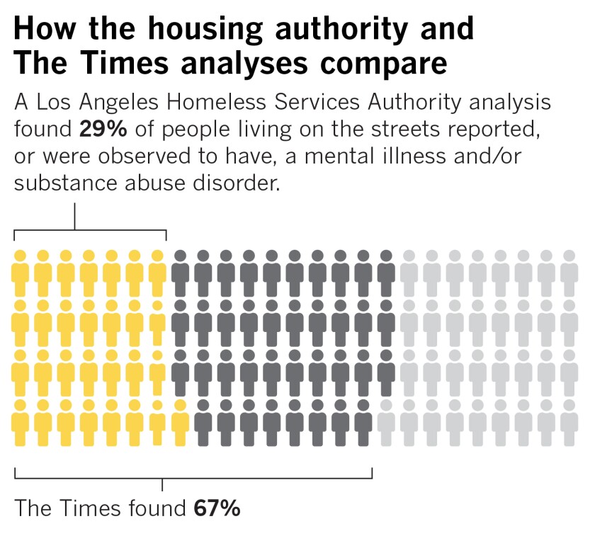 El Times, sin embargo, encontró que alrededor del 67% tenía una enfermedad mental o un trastorno por abuso de sustancias. Individualmente, el abuso de sustancias afecta al 46% de los que viven en la calle, más del triple de la tasa reportada anteriormente, y las enfermedades mentales, incluido el trastorno de estrés postraumático, afectan al 51% de los que viven en la calle, según el análisis.
