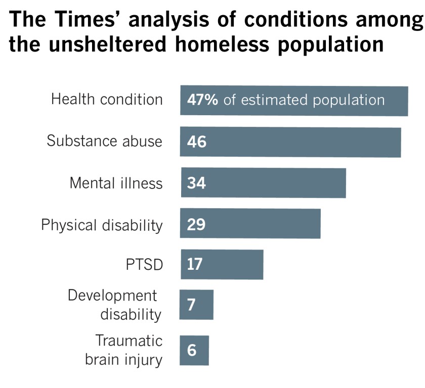 El Times encontró que el 50% de las personas sin techo tenían dos discapacidades al mismo tiempo y el 26% tenían tres a la vez, una condición conocida como triple morbilidad. Investigadores de la UCLA encontraron tri-morbilidad en la mitad de la población que estudiaron.