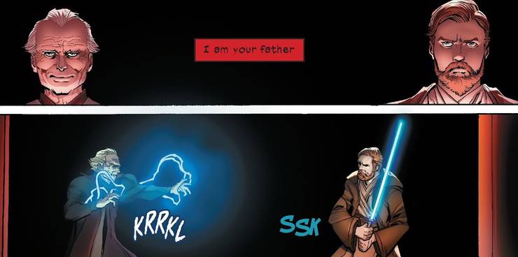 gerelateerd: Marvel onthult het verborgen geheim van Darth Vader ‘ s Rogue One Castle dit wordt bijna bevestigd wanneer Vader de specters van Palpatine en Obi-Wan Kenobi ontmoet in het hiernamaals. Voordat Palpatine Force lightning gebruikt om Obi-Wan te vernietigen, fluistert een stem tegen Vader: “Ik ben je vader,” terwijl hij naar beide mannen kijkt. We weten dat Obi-Wan niet de vader is, maar diep van binnen, erkent Vader dat hij meer een vaderfiguur voor hem is dan de schurk die hem hielp creëren. Het is geen toeval dat ze naast elkaar staan, naast elkaar staan, en eindelijk de vraag beantwoorden die fans al bijna twee decennia stellen. Hij was misschien niet zijn fysieke vader, maar Palpatine bewerkte gebeurtenissen zodat Anakin zou opstaan als Vader.