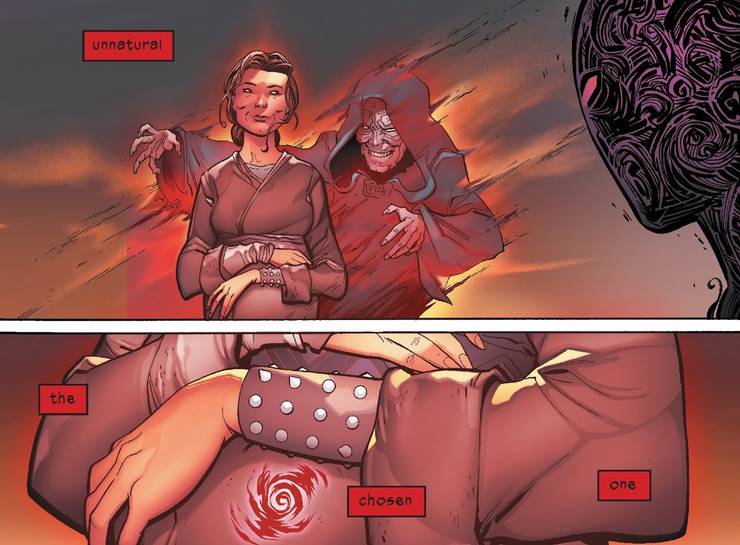 toen we hoorden van Darth Plagueis, ook bekend als “de wijze”, vertelde zijn leerling Palpatine (Darth Sidious) Anakin dat zijn mentor de midichlorianen (de levenskracht van het universum) om leven en dood zelf te beheersen. Dit is wat Anakin naar de Duistere Kant lokte, omdat zo ‘ n talent iemand in staat kon stellen om mensen te genezen en zelfs te doen herrijzen. Sindsdien wordt er gespeculeerd dat Plagueis de kracht gebruikte om midichlorianen te manipuleren en Shmi jaren later te bevruchten, en de uitverkorene creëerde — niet om een redder te zijn, maar een vernietiger.in plaats van de kracht in balans te brengen, geloofden samenzweringstheoretici dat Anakin mystiek was ontworpen om de machtsverhoudingen van de Jedi naar de Sith-orde te leiden. In Darth Vader # 25, zien we nu hoeveel geloof dat houdt, hoewel de meester manipulator is niet Plagueis, maar Palpatine zelf.